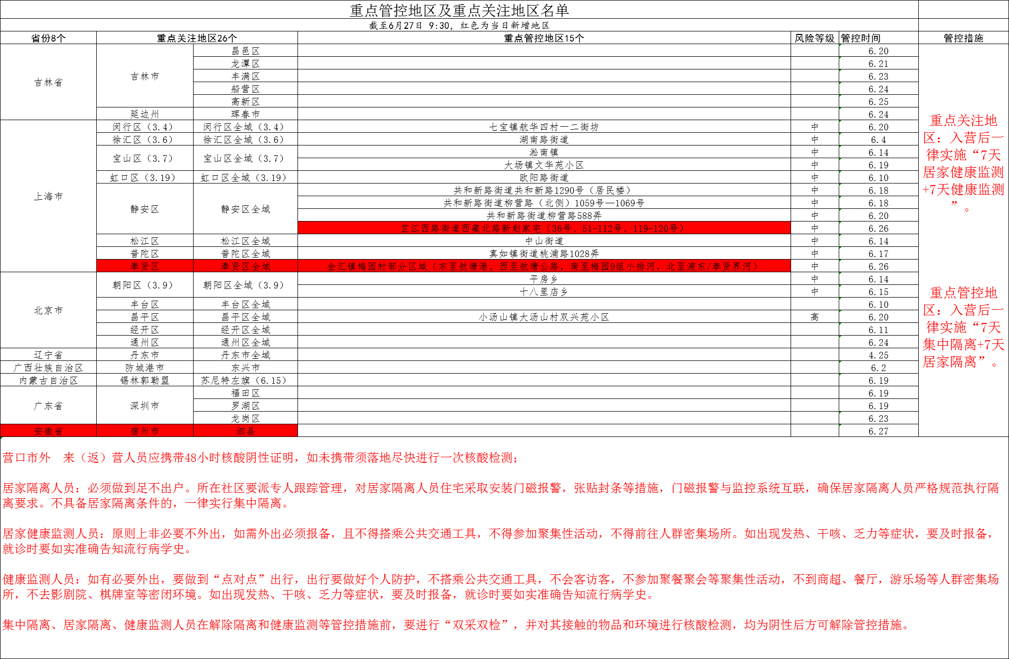 重点管控地区及重点关注地区名单(截至6月27日9:30)